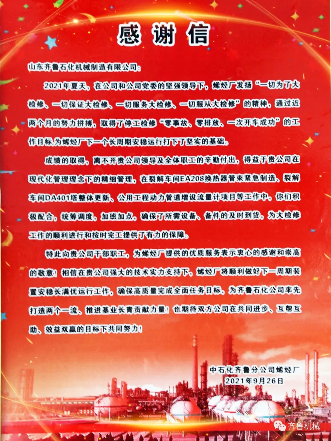 2021年9月30日中國石化齊魯分公司烯烴廠設(shè)備科副科長丁文岳、設(shè)備科許潔為公司送來感謝信,感謝機(jī)械公司全體員工在檢修期間響應(yīng)號召,積極配合,加班加點,攻堅克難,全力保障檢修,確保維修設(shè)備及更新設(shè)備及時準(zhǔn)確的供應(yīng)。